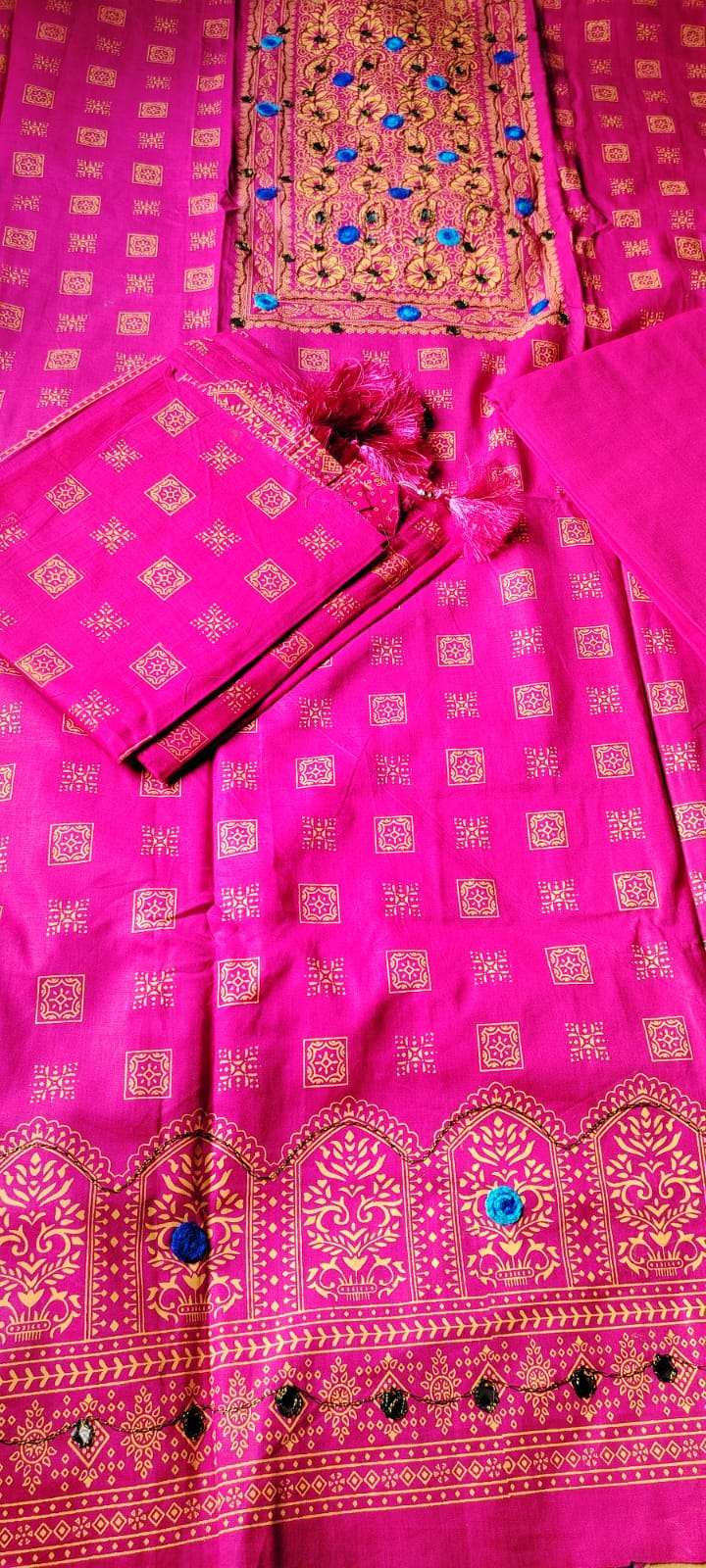 Block Print Three Piece ডিজাইনঃ ব্লক প্রিন্ট সেলাই বিহীন কামিজ লং ৪৬ ইঞ্চি (হাতার কাপড় আলাদা) ওরনা ৫ হাত সালোয়ার ২.৫ গজ