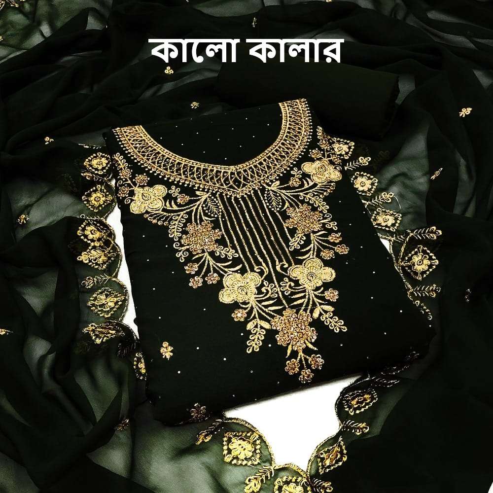 সংক্ষিপ্ত বর্ণনা: Georgette Embroidery Four Piece জর্জেট কাপড়ের এমব্রয়ডারি কাজ করা বাজেট ফ্রেন্ডলি ফোর পিস। কামিজ, ইনার, সেলয়ার এবং ওড়না জর্জেট কাপড়ের। কামিজের ফুল বডিতে এমব্রয়ডারি কাজ করা এবং চুমকি লাগানো। কামিজ অর্ধ সেলাই করা, বাকিটা সাইজমত বানিয়ে পরতে হবে। কামিজ বডি সাইজ ফ্রী এবং লং ৪০ ইঞ্চি।
